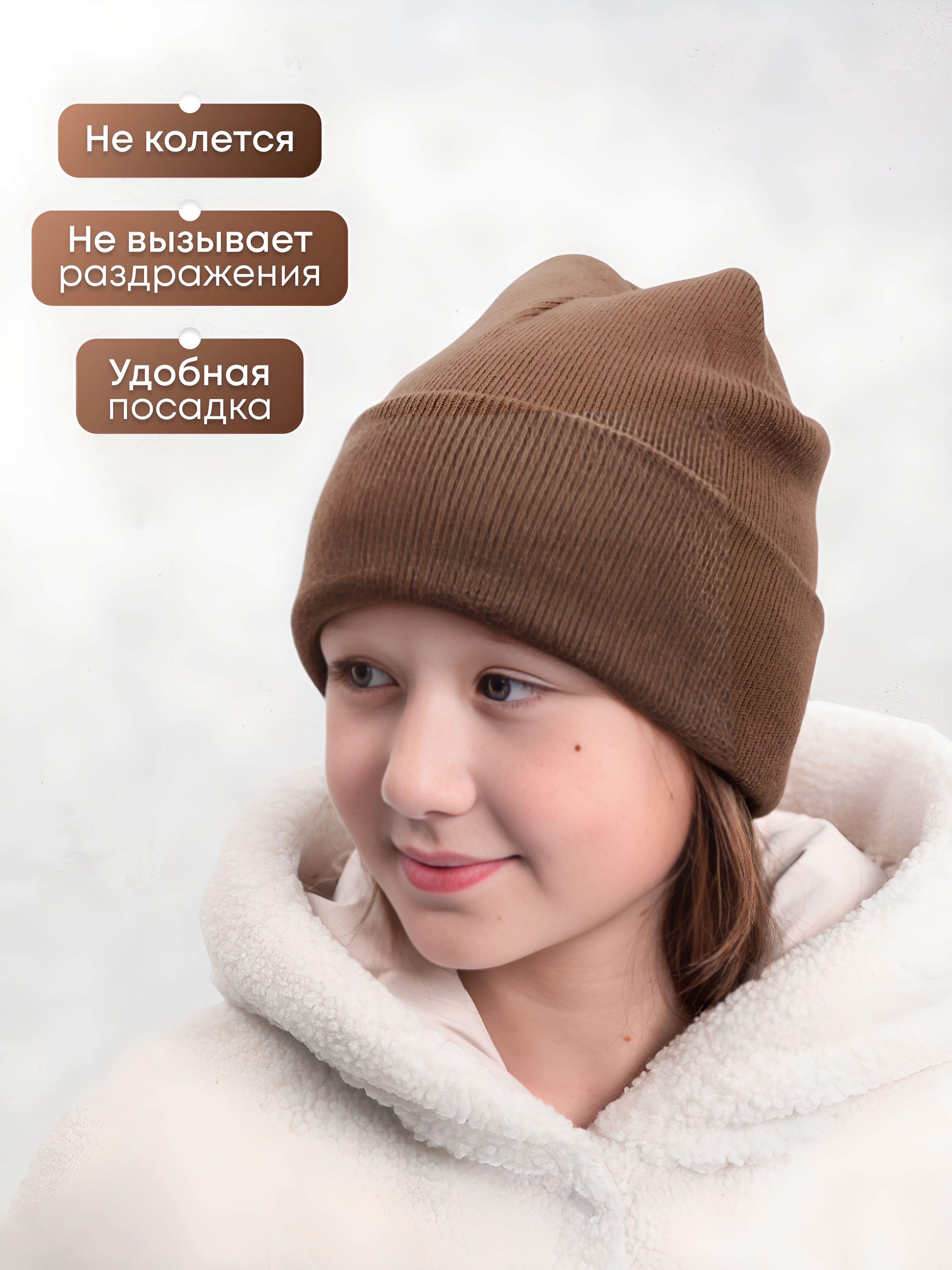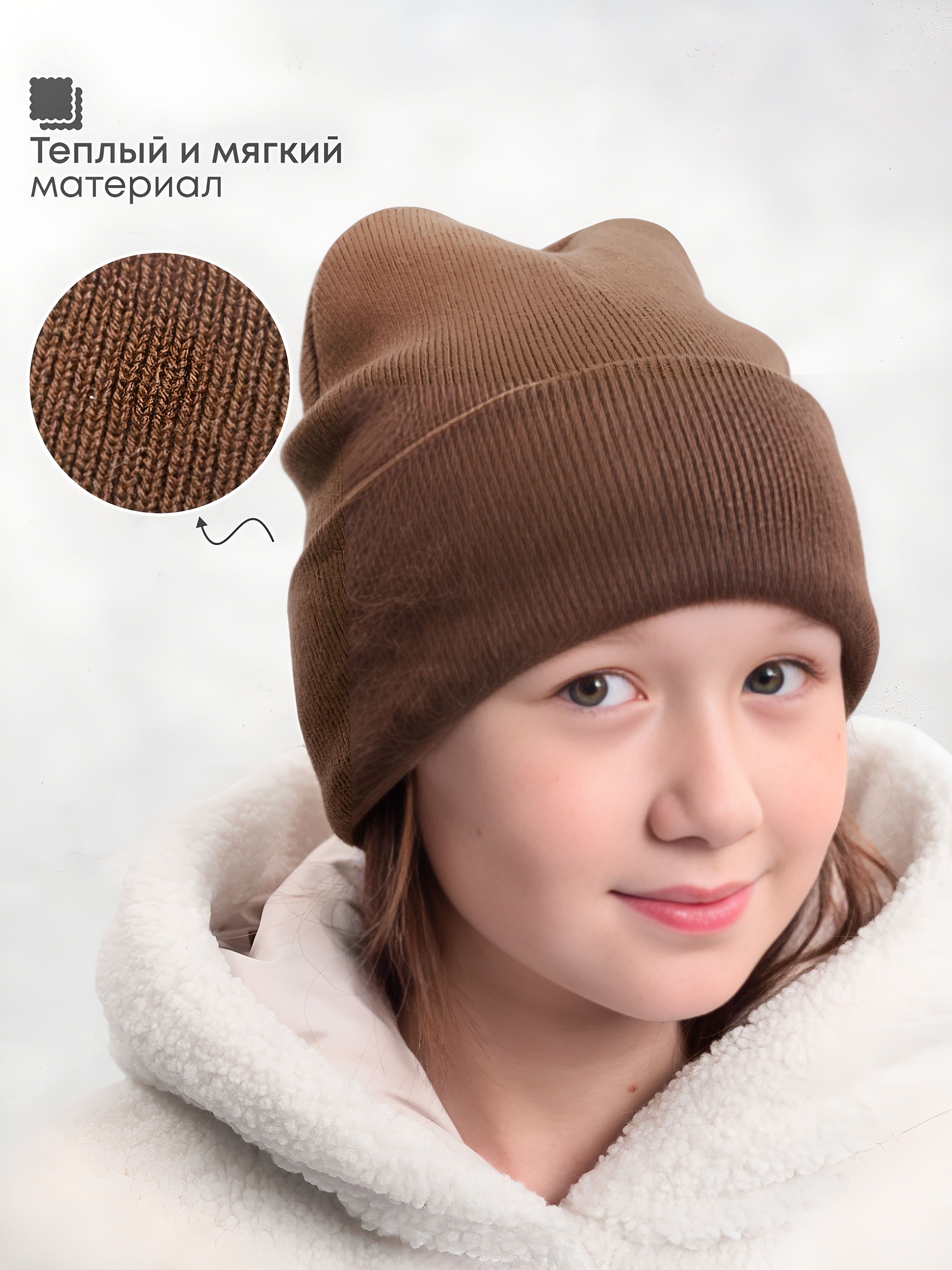 Изготовленная из 70% шерсти и 30% акрила, шапка предлагает оптимальное сочетание тепла и комфорта. Она имеет стильный однотонный коричневый цвет с отворотом, что делает ее особенно универсальной. Размеры доступны от 55 до 58, что позволяет подобрать идеальный вариант для вашего ребенка.